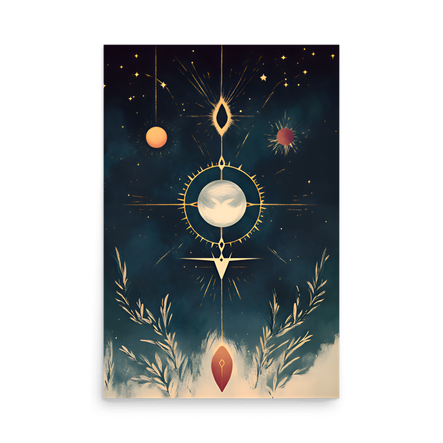 Dans un ciel feutré, les astres s’alignent en silence, révélant un passage intérieur que seul le calme permet d’emprunter. Cette œuvre poétique agit comme un seuil visuel, entre doute et clarté. Un poster bohème spirituel, à suspendre là où l’on cherche l’invisible et où la lumière se murmure.